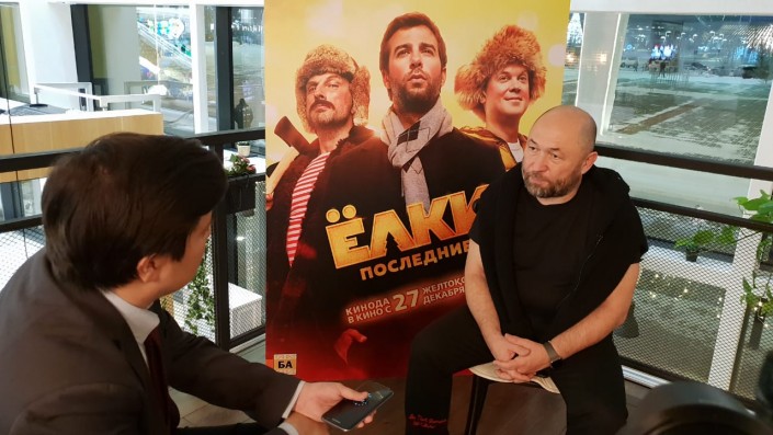 У нас есть фильм "Днюха". Но сейчас меня, если честно, интересует это уникальный проект (показывает на постер "Елок"). Там есть и свадьбы, и признания в любви, погони, собаки, кошки, пингвины, и Нагиевы, и Урганты. Этот проект существует уже 10 лет, и он стал одной из самых популярных франшиз в России, и если посчитать его совокупный доход, то, наверное, он самый успешный.