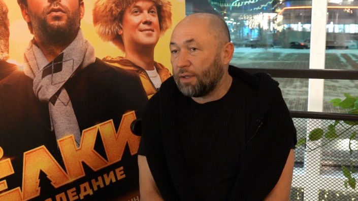 Вот как сейчас. Я езжу по России, приезжаю в Казахстан для того, чтобы рассказать зрителям о том, что выходит новый фильм, и о том, что в компании этих замечательных людей я провел год (снова показывает на постер). Вы знаете, в отличие от вас, у меня Новый год длится 365 дней в году, потому что зрители смотрят кино зимой, а мы снимаем его летом, поэтому у нас в июле, в июне Новый год. Мы засыпаем лес снегом, актеры ходят в шубах и шапках в 30-градусную жару, сыпется снег сверху, они делают вид, что им холодно, а потом на монтаже им вставляют компьютерный пар изо рта для ощущения зимы.