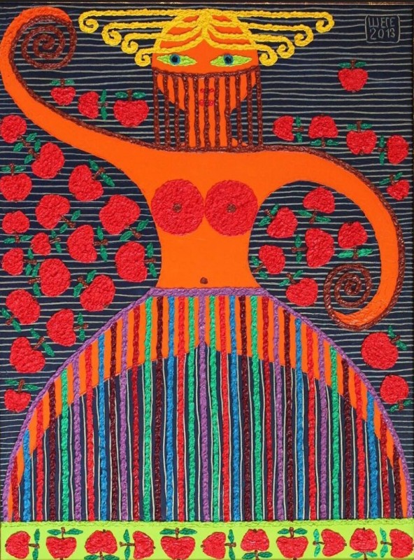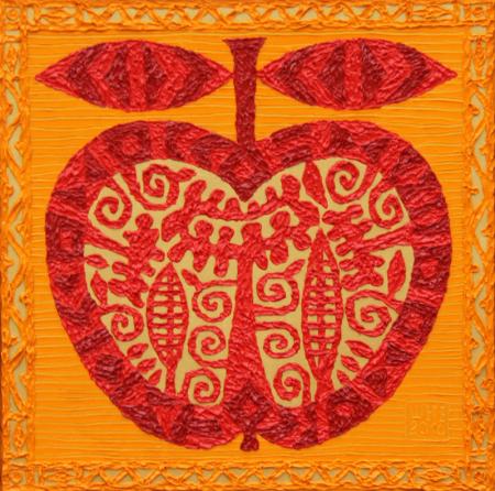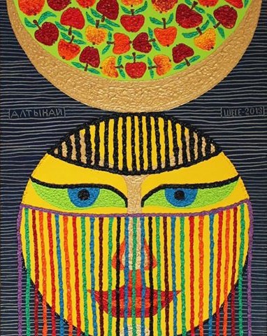 Все очень просто. Взял бы самый часто встречающийся элемент в моем творчестве – яблоко. Это серия изображений яблок, выполненных в разных цветах. Изначально, когда я начинал эту серию, преследовался коммерческий интерес: в Алматы в начале 90-х первые покупатели были иностранцы. Они вывозили казахстанскую символику.