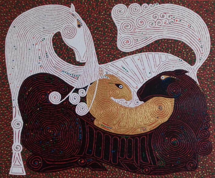 Иногда меня спрашивали, почему, живя в Казахстане, я не рисовал лошадей, а в Москве начал. Я думаю, что лошади для меня символизируют семью, отношения. И, создав семью здесь, я почувствовал потребность показывать это через образы лошадей. Есть у меня одна картина, где две лошади заботливо ухаживают, оберегают жеребенка. Ее второе название "Айналайын". Мне очень дорога эта картина. Также в России появились местные пейзажи: цветение багульника, зимние пейзажи, морские. Здесь я просто Гвоздев, приходится заново искать подход к публике. Хотя искусствоведы из Алматы говорят, что при всех моих изменениях руку все равно видно (улыбается).