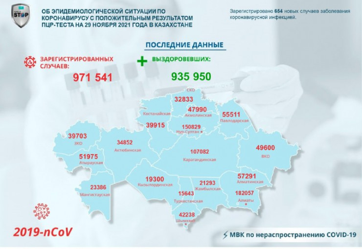 За прошедшие сутки (29 ноября) в Казахстане зарегистрировано 654 новых случая заболевания коронавирусной инфекцией, передает Tengrinews.kz со ссылкой на данные Межведомственной комиссии по нераспространению COVID-19.