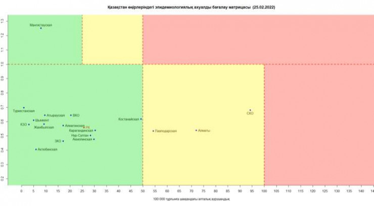По данным матрицы оценки эпидемиологической ситуации, в "красной" зоне на 25 февраля не осталось ни одного региона, передает корреспондент Tengrinews.kz со ссылкой на Межведомственную комиссию по нераспространению COVID-19.