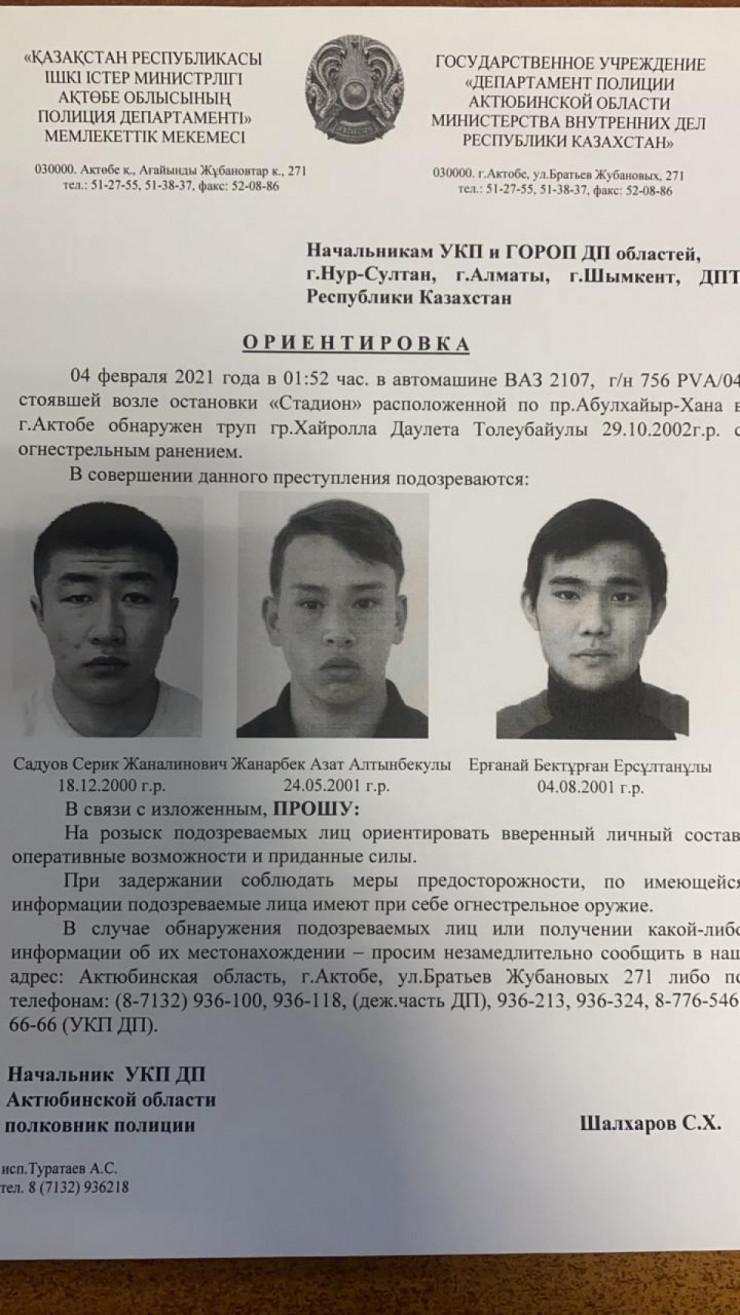 После этого в пабликах была распространена ориентировка ДП, в которой говорилось, что убитый – Даулет Хайролла. По подозрению в убийстве в розыск были объявлены Серик С. 2000 года рождения, Азат Ж. 2001 года рождения и Бектурган Е. 2001 года рождения.