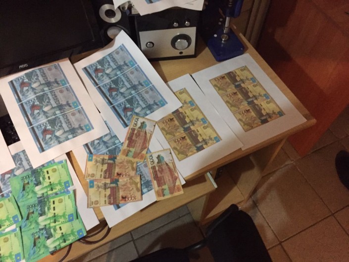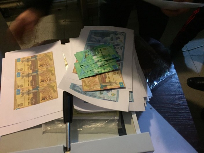 В ходе обыска типографии обнаружены и изъяты фальшивые купюры с различными номерами на сумму 25 тысяч тенге, 28 листов формата А4, на которых были нанесены цветным принтером формы купюр номиналами 1000, 2000, 10 000 тенге, специальные бумаги, а также цветные принтеры и компьютеры.