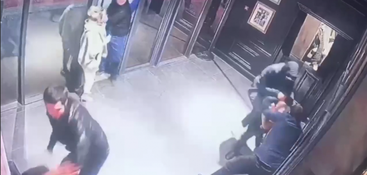 На кадрах видно, как несколько мужчин зашли в бар, подошли к двоим мужчинам и стали наносить им удары.