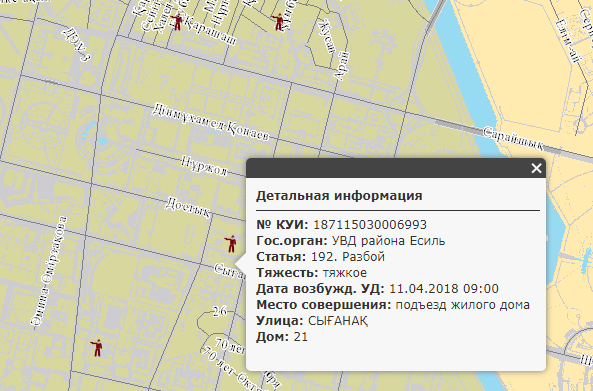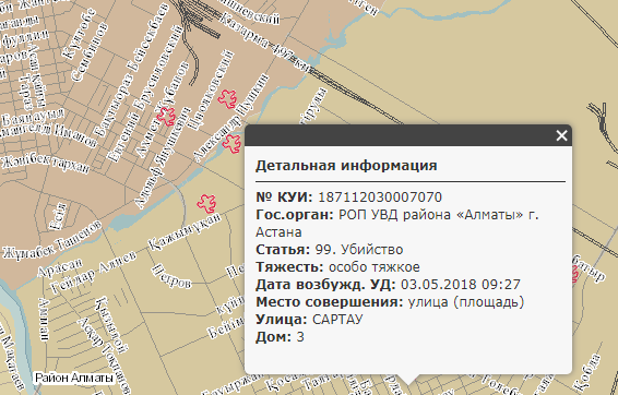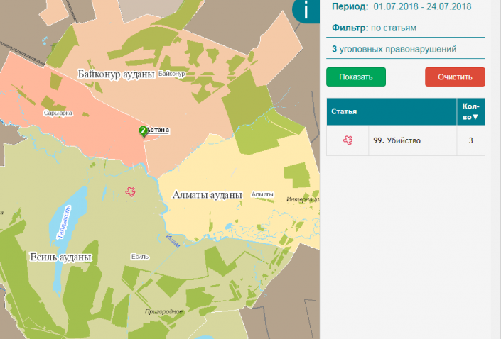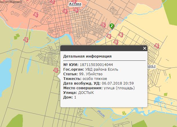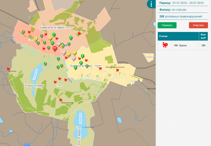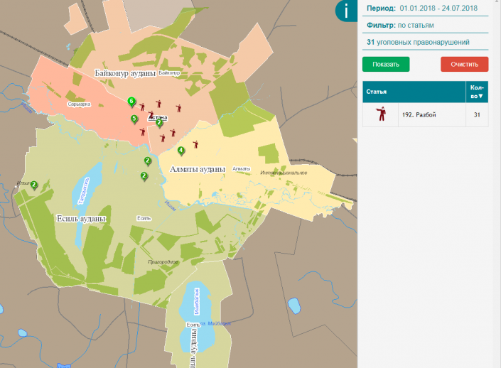 В столице Казахстана с начала года было совершено более 12 тысяч уголовных правонарушений. Согласно данным Карты преступности в Астане с 1 января было совершено 24 убийства. Один трагичный случай произошел в день рождения столицы, 6 июля, в центре левого берега.