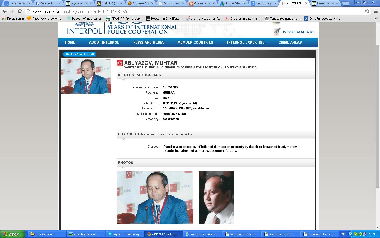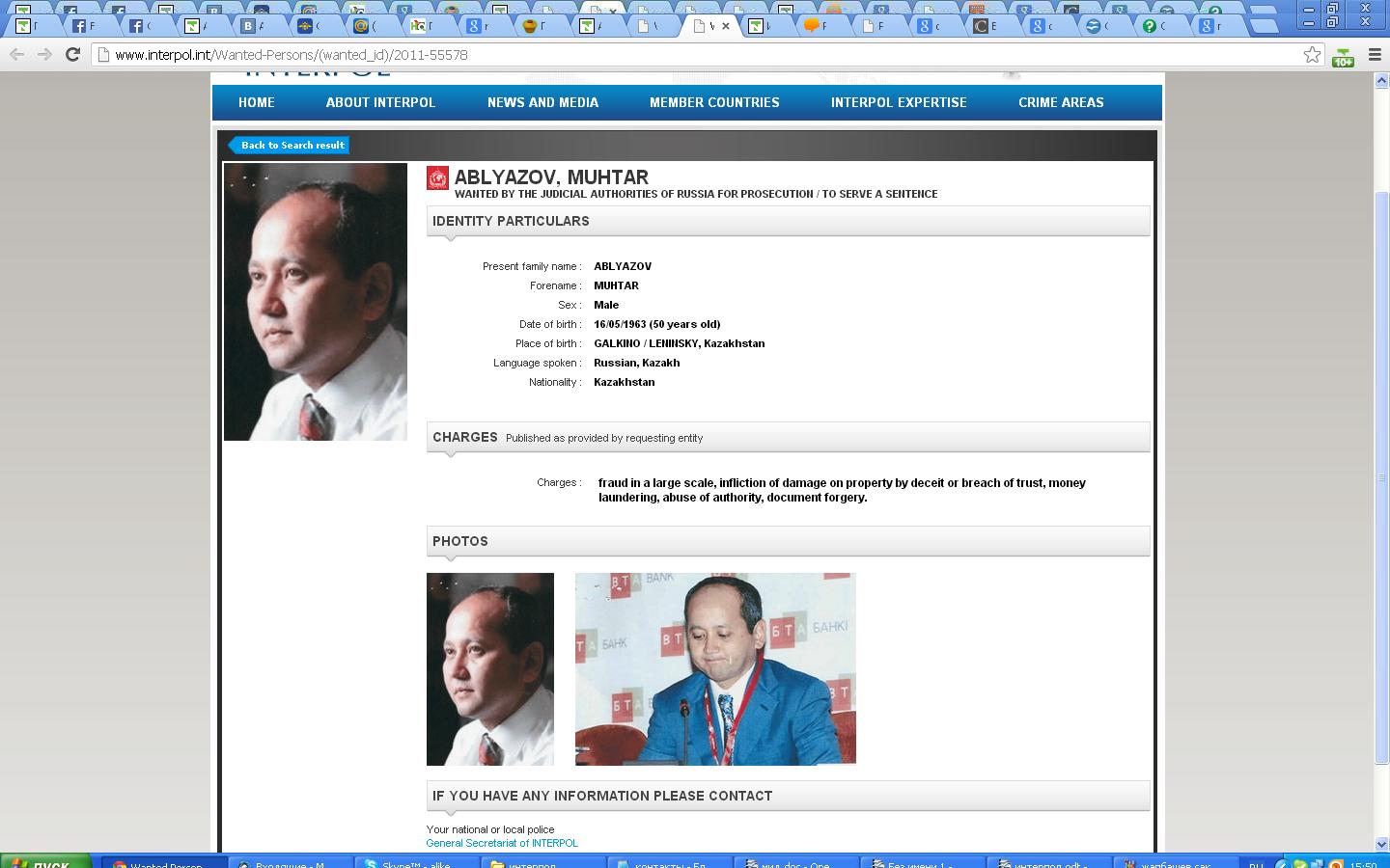 В свою очередь, сам Мухтар Аблязов, разыскиваемый по запросу Российской Федерации, до сих пор фигурирует в списке Интерпола, несмотря на то, что он был задержан во Франции и сейчас решается вопрос о его экстрадиции. Правда, изменился внешний вид объявления. Если в 2013 году до задержания олигарха в качестве главной была представлена фотография, на которой он смотрит в сторону, то на свежем объявлении на сайте Интерпола поставлено фото, на котором взгляд экс-главы БТА Банка направлен вниз.