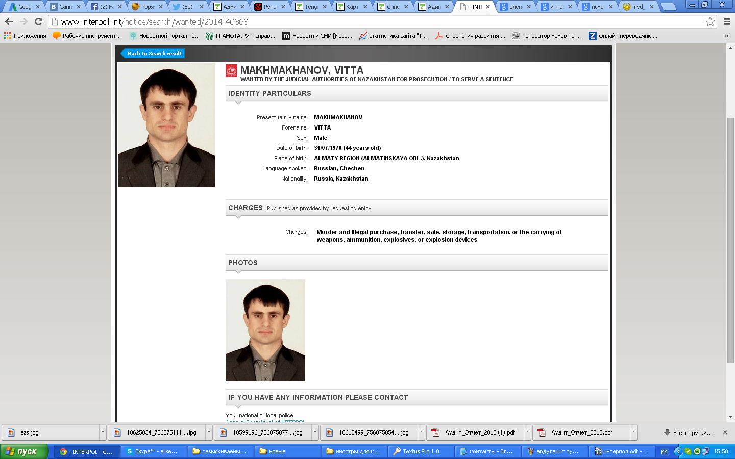Также в списках Интерпола появился 44-летний уроженец Алматинской области Витта Махмаханов. Он разыскивается по обвинению в убийстве, нелегальном приобретении, хранении, продаже, перевозке оружия, патронов к нему и взрывчатых веществ. Инициатором розыска является управление криминальной полиции ДВД Карагандинской области. Розыскное дело в отношении Махмаханова было заведено 17 июня 2014 года. В его отношении в Казахстане заведено уголовное дело по статье "Убийство", по которой ему грозит пожизненное заключение.