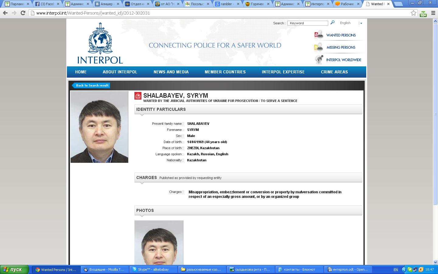 Интерпол перестал разыскивать шурина Мухтара Аблязова Сырыма Шалабаева, передает корреспондент Tengrinews.kz со ссылкой на данные официального портала организации. Напомним, еще в июле 2013 года Шалабаев значился в списке разыскиваемых казахстанцев. Его искали по запросу властей Украины. Сейчас по запросу Shalabayev Syrym сайт Интерпола данных не предоставляет.