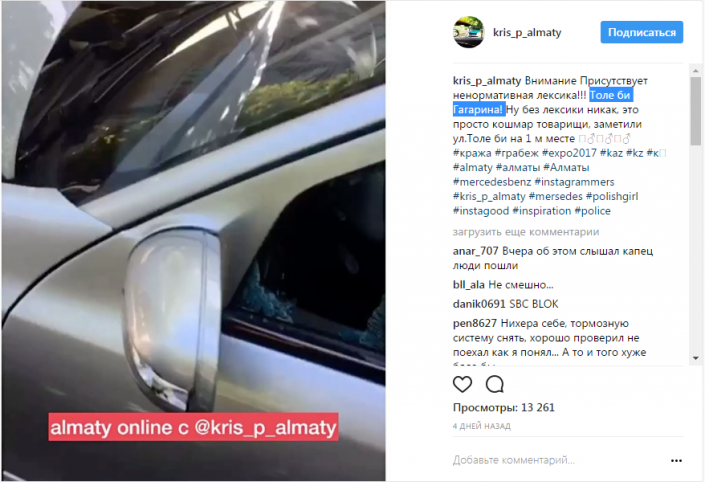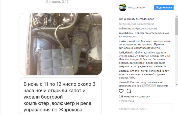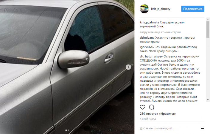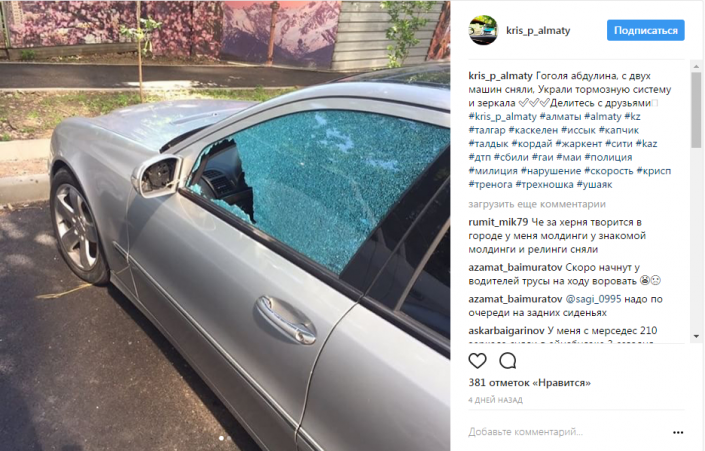 Только за последнюю неделю десятки сообщений от автовладельцев, ставших жертвами злоумышленников, появились на аккаунте @kris_p_almaty в Instagram. При этом во многих случаях почерк одинаковый - злоумышленники разбивают боковое окно и вскрывают капот авто.