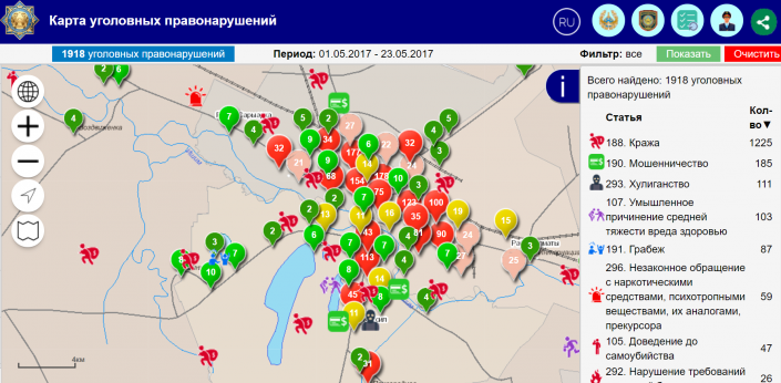 Все сведения о преступлениях начинают отображаться на Карте уголовных правонарушений в течение нескольких минут после регистрации заявления или сообщения о случившемся.