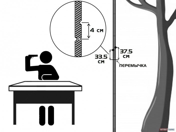 Правозащитник, взяв линейку, измерил расстояние от перемычки, соединяющей панели, до внутренней выемки - 33,5 сантиметра (на схеме). А от перемычки до наружной выемки - 37,5 сантиметра. "Панель тонкая - как лист фанеры, - объясняет Салим Отен. - Не может быть, чтобы пуля залетела в панель, а потом на четыре сантиметра поднялась и вышла с другой стороны".