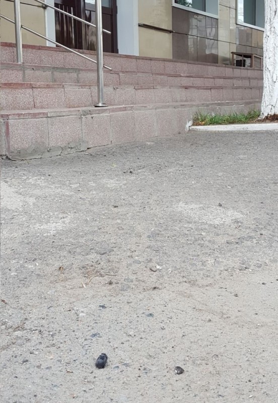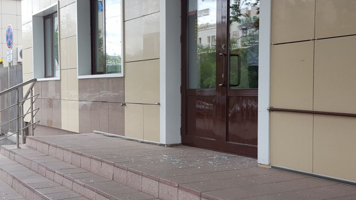 У входа в магазин видны осколки разбитого стекла, со слов охранника, нападавший успел молотком выбил стекло на внутренней двери здания.