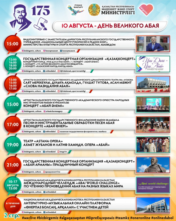 В этом году исполняется 175 лет со дня рождения Абая Кунанбаева. 10 августа был объявлен Днем Абая, дата была внесена в официальный перечень праздников.