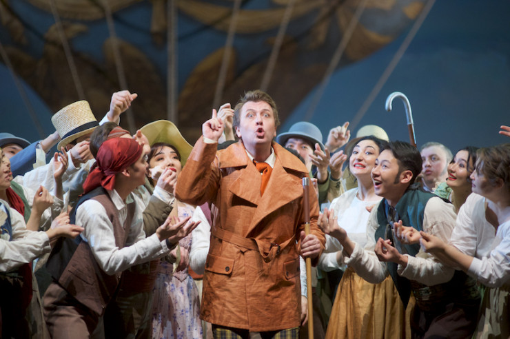 Французский постановщик Арно Бернар пошел по пути традиционной, не режиссерской, оперы и выдержал спектакль полностью в соответствии с эпохой, практически такой, какой мы могли бы увидеть ее при жизни авторов. Но понятно, что оперный жанр условный, поэтому эту классическую постановку украсили интересные находки Арно Бернара в виде появления героев из-под сценического пространства, ну а пройдоха Дулькамара улетел в конце спектакля на воздушном шаре, все это очень гармонично выглядело в свете современных реалий и приближало великое творение композитора зрительскому восприятию.