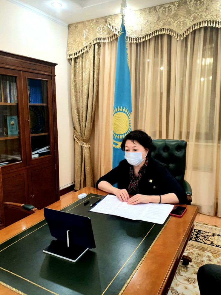 Министр культуры и спорта Актоты Раимкулова поприветствовала участников онлайн и отметила высокий вклад Абая в развитие литературы, культуры и творчества.