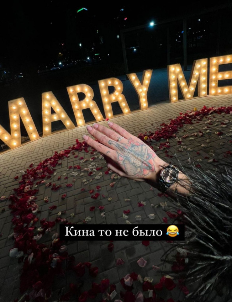 На предложении-сюрпризе присутствовали самые близкие люди Айжан: мама, брат Алихан, сын Алан. Девушку с завязанными глазами подвели к заветной фразе Marry me, и, стоя посреди огромного сердца из лепестков роз вместе со своим женихом, она сказала "да".