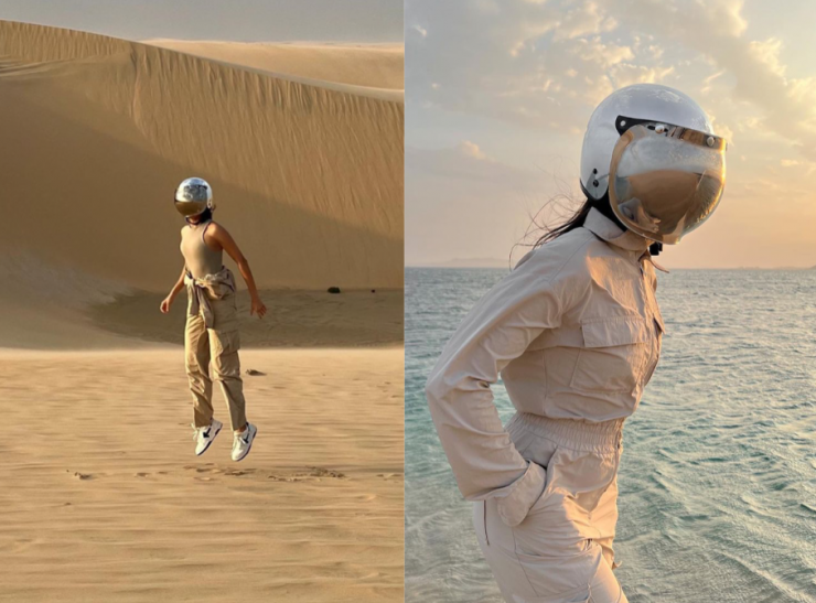 Удивились не только простые пользователи Сети, но и популярные блогеры. Так, lifestyle-блогер Гаухар Жексен отмечает, что Кайрат Нуртас сделал косплей на нее. Недавно девушка участвовала в фотосессии на фоне пустынного пейзажа и моря в мотошлеме.