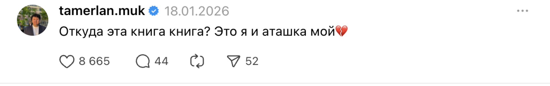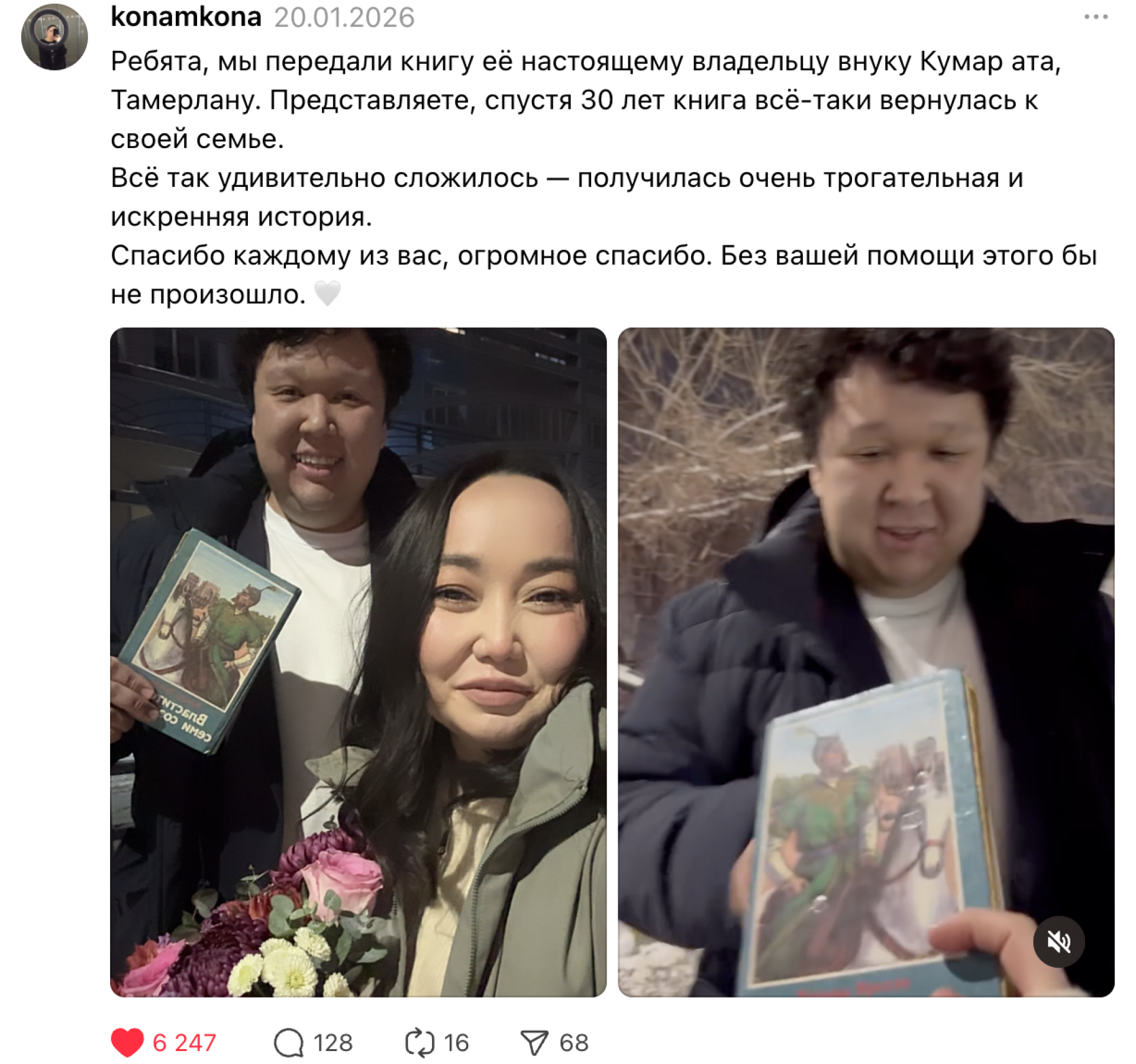 Пост набрал более 240 тысяч просмотров, более 6 тысяч лайков за считаные часы. Сам же хозяин книги нашелся менее чем за сутки. Им оказался Тамерлан Мукашев, алматинец.