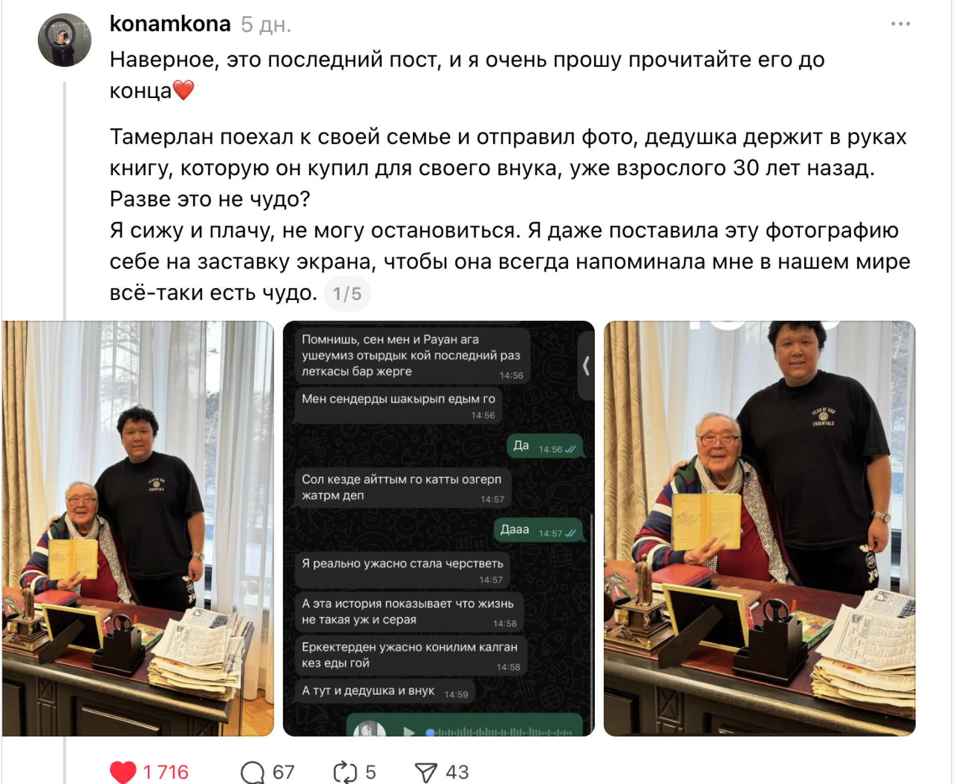 "Я — мама Тамерлана. И, слава Богу, и дедушка, и мой сын живы и здоровы. Скорее всего, осенью 1996 года, будучи в Ташкенте, дедушка купил эту книгу в подарок своему первому внуку и просто забыл её в санатории в Сарыагаше. Какое чудо, что она нашлась спустя почти 30 лет! Теперь это будет наша семейная реликвия! Спасибо Вам за такое бережное хранение и то, что поделились информацией в Threads", — написала она.