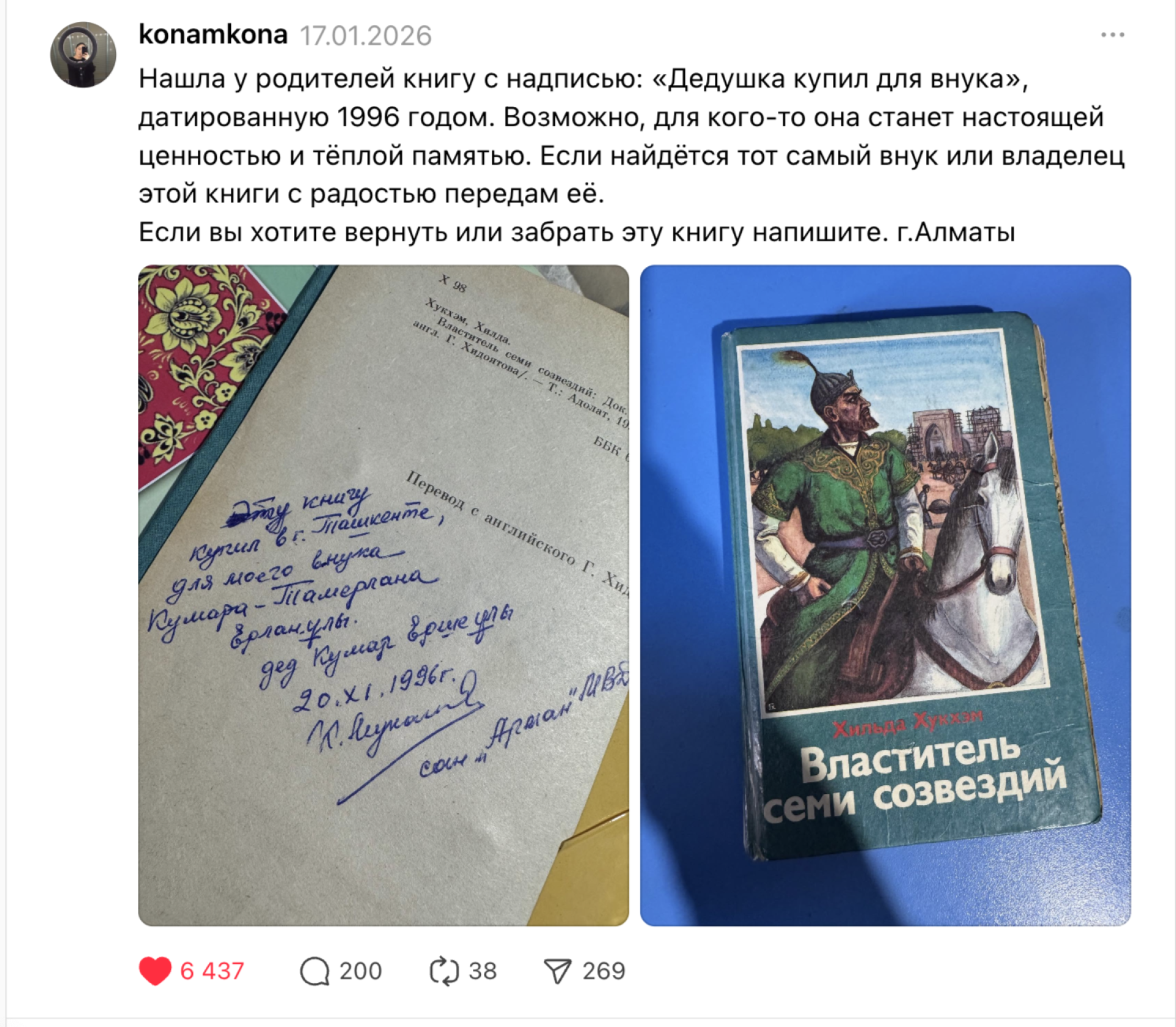 "Нашла у родителей книгу с надписью: "Дедушка купил для внука", датированную 1996 годом. Возможно, для кого-то она станет настоящей ценностью и тёплой памятью. Если найдётся тот самый внук или владелец этой книги, с радостью передам её. Если вы хотите вернуть или забрать эту книгу, напишите. Город Алматы", — написала автор.