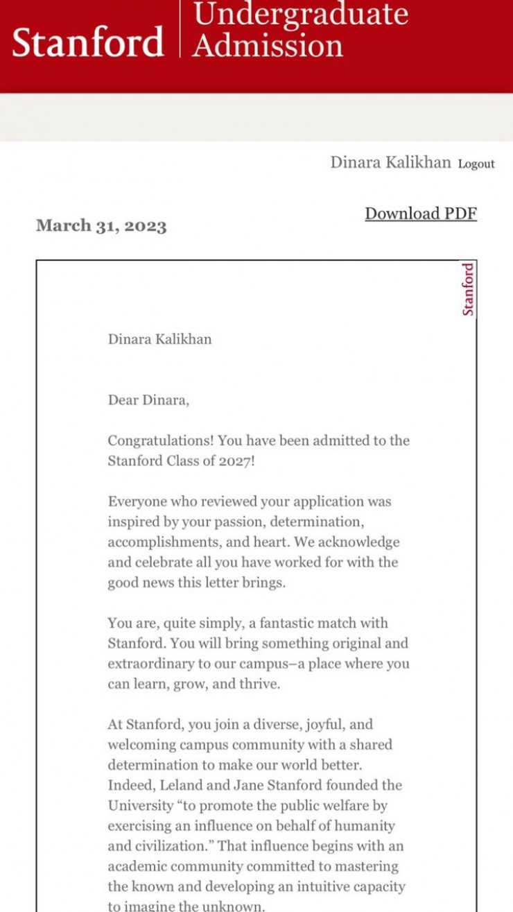 "Я получила 26 оферов (приглашений - прим.). В том числе от University of California Berkeley, Fordham University, King’s College London и другие. И среди них было самое заветное - от Стэнфорда. Когда я открыла письмо и увидела: "Поздравляем!", я едва не разрыдалась от счастья. Труд и старания окупились. Я выбрала двойную специальность - экономика и информационные технологии.