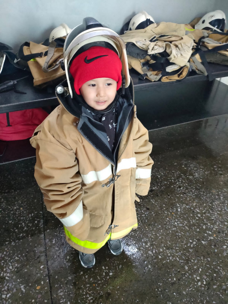 Ребенку показали пожарно-спасательную технику, познакомили с караулом, прокатили на машине и дали примерить спецодежду.