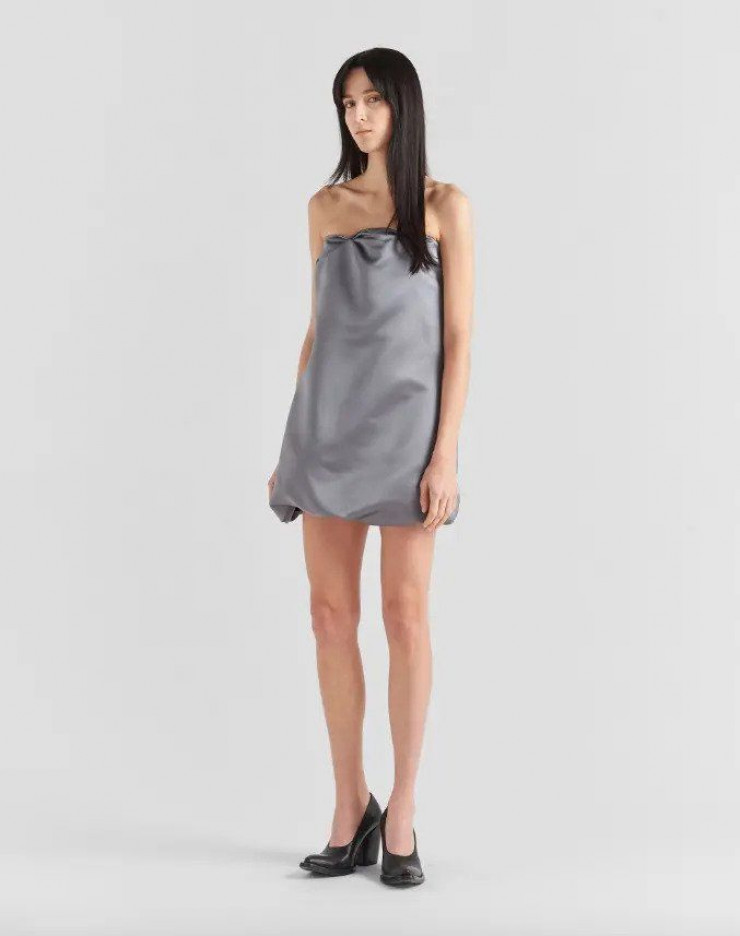 Речь идет об объемном мини-платье прямого кроя без бретелей, которое изготовлено из серого атласного материала. Стоимость вещи из коллекции весна-лето 2023 составляет 3650 долларов (свыше 1,6 миллиона тенге). Кроме того, марка выпустила длинную версию платья, на данный момент она доступна по цене 4100 долларов (свыше 1,8 миллиона тенге).