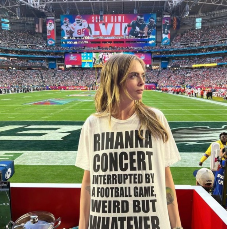 А Кара Делевинь пришла на стадион в футболке с шутливой надписью: "Концерт Рианны, прерванный футбольной игрой, – странно, ну да ладно".