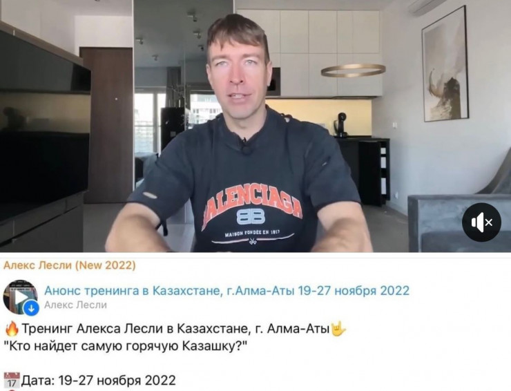 "Знаменитый выездной тренинг по соблазнению в Казахстане, лучший вариант совмещения отдыха и соблазнения, два в одном, в теплом городе Алма-Аты с огромным количеством красивых женщин на улицах!" - такое сообщение в социальных сетях разместил Лесли.