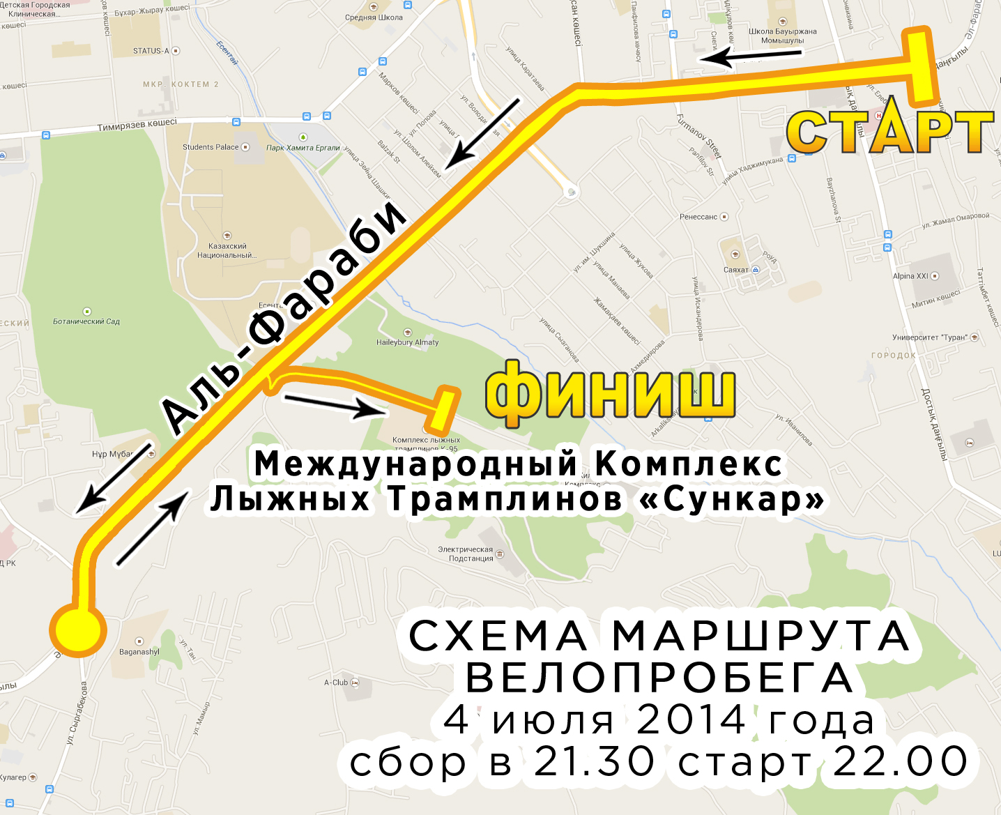 Участники проедут в западном направлении до улицы Сыргабекова, затем обратно до финиша у Международного комплекса лыжных трамплинов "Сункар". Сбор участников велопробега в Алматы состоится в 21.30. Оргкомитет призывает желающих прокатиться по городу ночью обеспечить светодиодное оформление экипировки (катафоты, фонари и другое) и оснастить велосипеды и одежду светоотражающими аксессуарами (светоотражающие ленты и повязки). Также участники получат светящиеся браслеты на старте от организаторов.