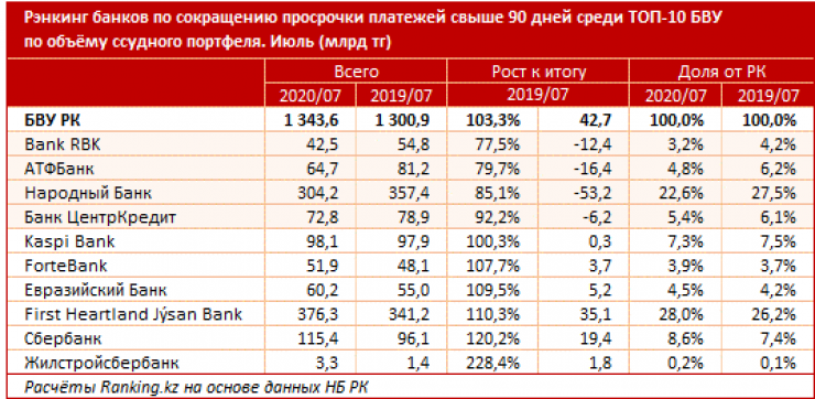 Сумму просроченной свыше 90 дней задолженности сократили также АТФБанк (−20,3 процента), Народный Банк (−14,9 процента) и Банк ЦентрКредит (−7,8 процента).