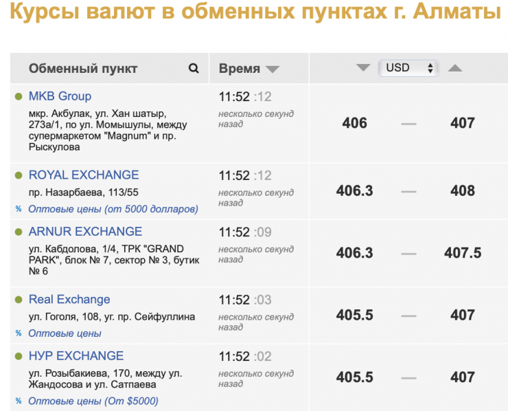 Между тем, по данным kurs.kz, в обменных пунктах Нур-Султана американскую валюту продают за 406.8-407 тенге, Алматы - 407.5-408 тенге.