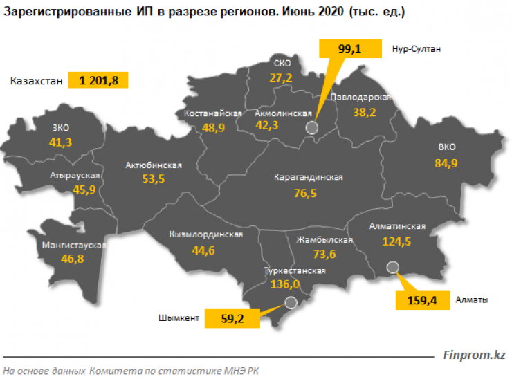 Среди регионов самое большое количество зарегистрированных ИП зафиксировано в Алматы: 159,4 тысячи. Это на 1,5 процента меньше, чем в прошлом году. Следом идут Туркестанская (136 тысяч) и Алматинская (124,5 тысячи) области.