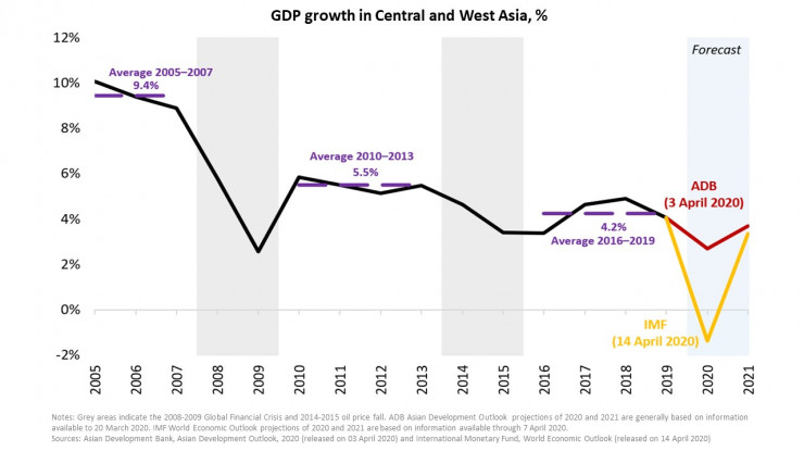 "Вспышка COVID-19 приведет мировую экономику к серьезной рецессии в 2020 году. С начала марта пандемия быстро распространилась по Центральной и Западной Азии, которая включает в себя Афганистан, Армению, Азербайджан, Грузию, Казахстан, Кыргызскую Республику, Пакистан, Таджикистан, Туркменистан и Узбекистан", - отмечают специалисты.