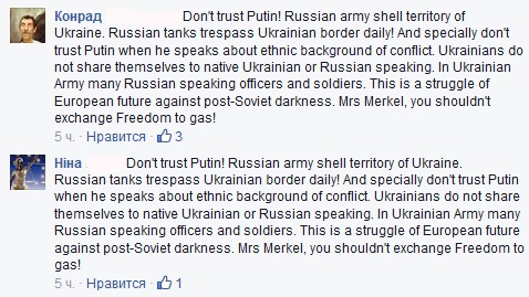 Кроме того, пользователи постят на странице канцлера англоязычный текст следующего содержания: "Не доверяйте Путину! Русская армия обстреливает территорию Украины. Российские танки пересекают украинскую границу ежедневно! А особо не доверяйте Путину, когда он говорит об этнических предпосылках конфликта. Украинцы не разделяют себя на украиноязычных или русскоязычных. В украинской армии много русскоязычных офицеров и солдат. Это борьба европейского будущего против постсоветского мрака, госпожа Меркель, вы не должны променять Свободу на газ!"
