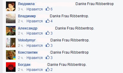 Пользователи Интернета, в основном украинские, начали массово оставлять на официальной странице канцлера Германии Ангелы Меркель в Facebooк комментарии с одной и той же фразой, состоящей из трех слов: Danke, Frau Ribbentrop ("Спасибо, госпожа Риббентроп"), сообщает BBC News. Таким образом, пользователи выражают недовольство позицией Меркель, сравнивая ее с министром иностранных дел фашистской Германии и советником Гитлера по внешней политике Иоахимом фон Риббентропом.