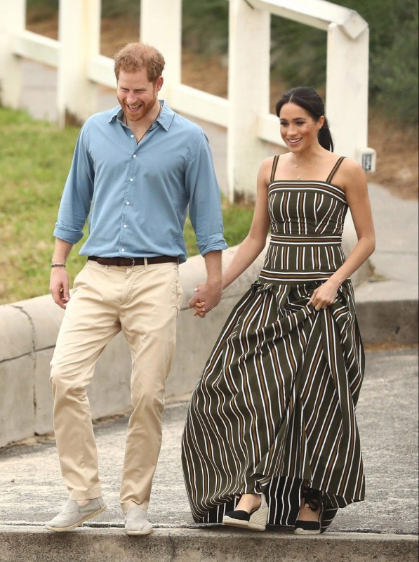 Беременная Маркл появилась на пляже Бонди в пригороде Сиднея в черных туфлях-эспадрильях на танкетке испанского бренда Castaner. Однако о том, что королева Великобритании Елизавета II терпеть не может туфли на танкетке, знают все женщины в королевской семье, в том числе и жена принца Гарри.