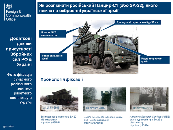 Британские дипломаты обнародовали материал под названием "Как распознать российский "Панцирь-С1", которого нет на вооружении украинской армии". В нем приводятся архивная фотография зенитного ракетно-пушечного комплекса "Панцирь-С1", его описание, три фотографии, ранее появлявшиеся в СМИ, а также приводится хронология, где и когда "Панцирь" якобы был зафиксирован в Донбассе.