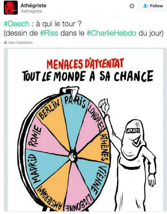 Спустя несколько часов на сайте появилась другая карикатура. На ней изображены разбросанные силой взрыва частей тела и виднеется голова одного из террористов.