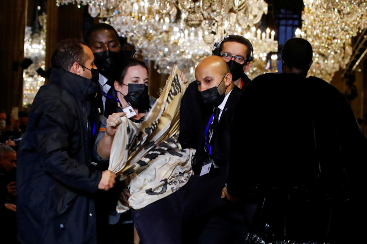 Так, во время показа девушка с плакатом "Чрезмерное потребление = вымирание" прошла по подиуму вместе с моделями, что вызвало переполох у присутствующих. Протестующую с подиума вынесли охранники, показ бренда при этом продолжился.