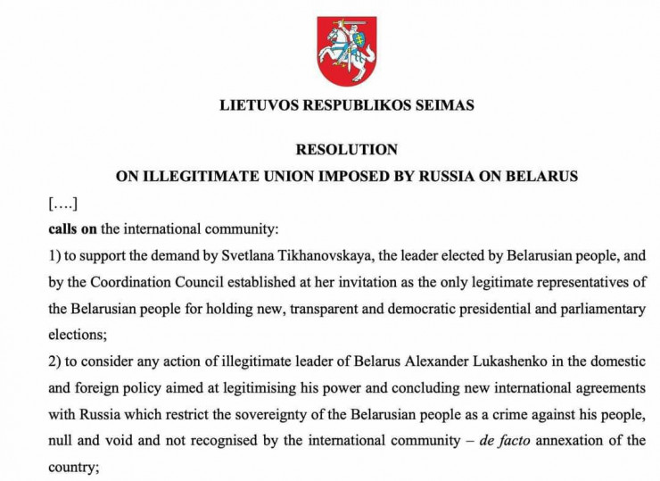 "Любые действия нелегитимного белорусского лидера Александра Лукашенко во внутренней и внешней политике, направленные на легитимизацию его правления и заключение с Россией новых международных соглашений, ограничивающих суверенитет белорусского народа, являются преступлением против его народа, недействительными и де-факто аннексией", - говорится в резолюции.