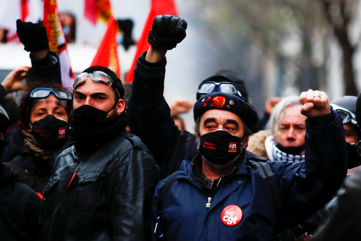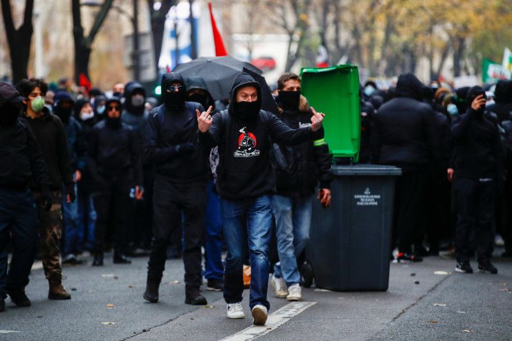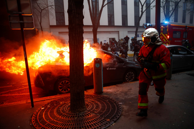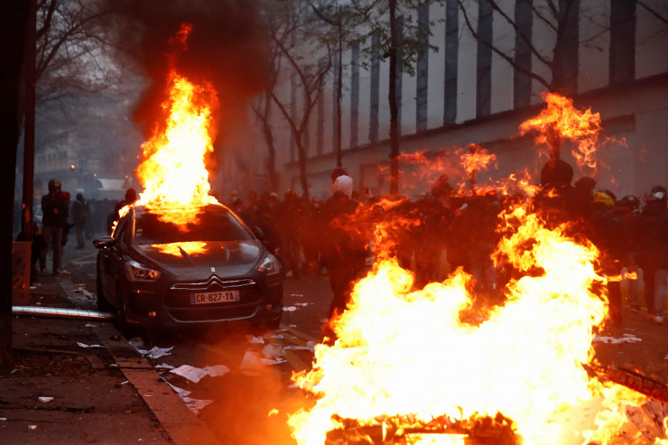 Беспорядки на акции протеста в Париже начались около 15.00 (20.00 по времени Нур-Султана), когда агрессивно настроенные молодые люди, одетые в черное, начали бросать в полицейских камни и бутылки. Они громили витрины офисов, обливали их краской, поджигали сооруженные ими баррикады, выкручивали камеры наружного видеонаблюдения. Погромщики сожгли как минимум три машины.