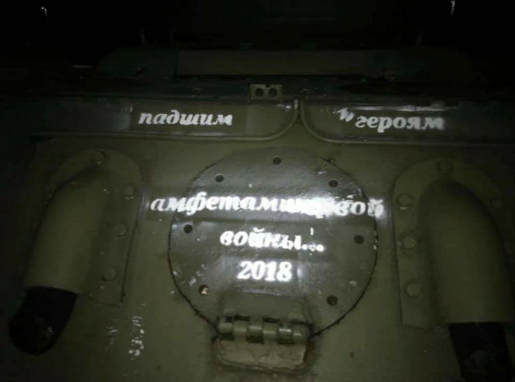 Женщина написала на своей странице в Facebook, что на танке появились надписи, чествующие "падших" героев "амфетаминовой войны".