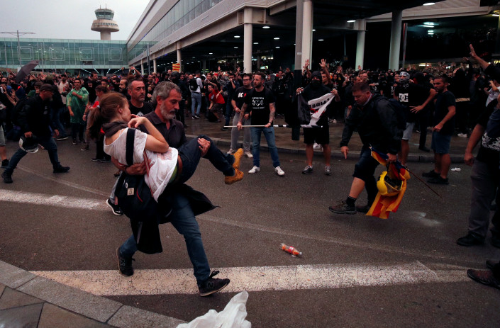 Самая сложная ситуация сложилась в аэропорту Барселоны. Радикальная организация "Демократическое цунами" в соцсетях призвало сторонников независимости направляться в аэропорт Барселоны. Несколько десятков человек, несмотря на оцепление, смогли зайти в здание. Произошли столкновения с полицией. В течение всего дня к аэропорту подходили все новые протестующие, они заблокировали дорогу к аэропорту, где в результате собрались несколько тысяч человек. Экипажи многих рейсов не смогли вовремя добраться до самолетов.