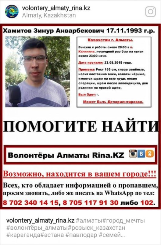 24-летний алматинец Зинур Хамитов поехал забирать долг в размере100 тысяч тенге и пропал. Об этом Tengrinews.kz сообщила его мама Альфия Хамитова.