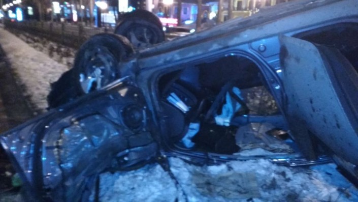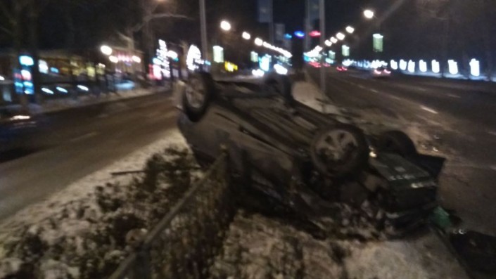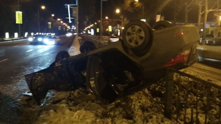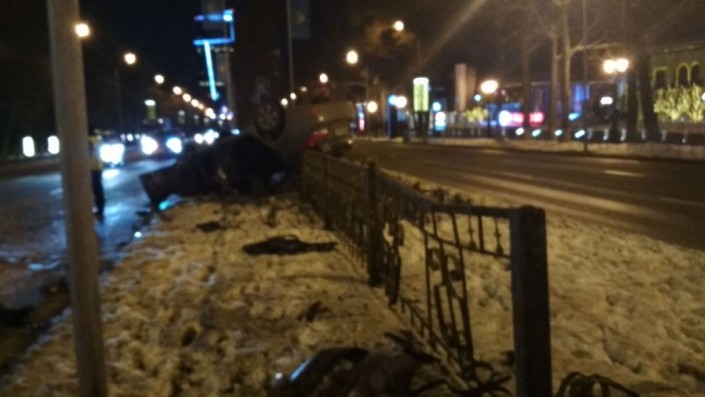 В Алматы Hyundai перевернулся и протаранил несколько секций ограждения на Аль-Фараби