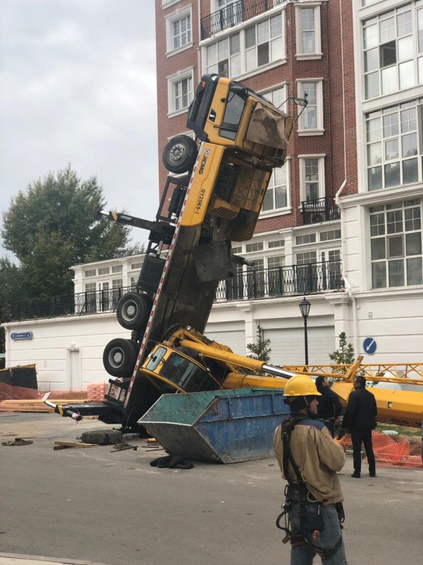 Очевидцы записали видео с места происшествия. На кадрах видно, как автокран XCMG лежит кабиной вверх. Рядом стоит легковое авто с помятым крылом. Часть упавшего крана повредила асфальт. Вокруг техники стоят рабочие в касках.