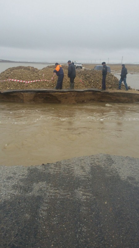 По словам жителей села Буркитти, размыв дороги произошел 11 апреля. Опасный участок ведет к селу Егиндибулак. Водителю удалось выбраться на сушу, а машину смогли достать только на следующий день.
