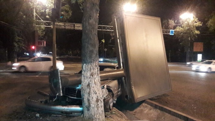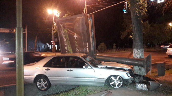 Еще одно ДТП произошло на пересечении проспекта Абая с улицей Наурызбай батыра. Mercedes-Benz "кабан" на полном ходу сбил рекламный билборд. Аварию совершил приезжий водитель, судя по всему плохо знающий город. Жизнь ему спасла подушка безопасности.